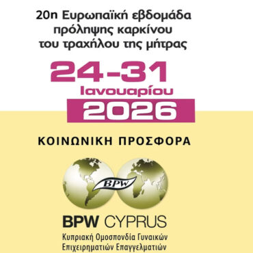 Η BPW Cyprus, Κυπριακή Ομοσπονδία Γυναικών Επιχειρηματιών Επαγγελμάτων (ΚΟΓΕΕ), αναλαμβάνει φέτος μια δυναμική Παγκύπρια Εκστρατεία Ενημέρωσης με αφορμή την 20η Ευρωπαϊκή Εβδομάδα Πρόληψης του Καρκίνου του Τραχήλου της Μήτρας. Με το σύνθημα «ΠΑΠ τεστ σήμερα – Όχι κάποια μέρα», στόχος της BPW Cyprus είναι να κινητοποιηθούν οι γυναίκες της Κύπρου να θέσουν την πρόληψη σε προτεραιότητα, κάνοντας το τεστ Παπανικολάου, και καταπολεμώντας την αναβλητικότητα που συχνά αποβαίνει μοιραία για την […]